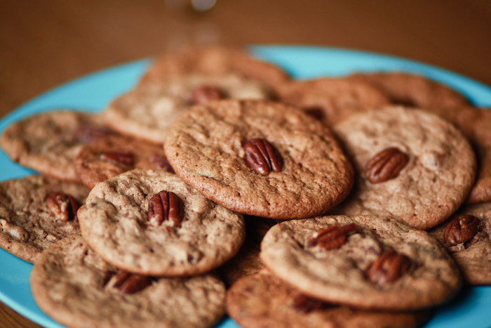 Piekarnik nagrzać do temp 180 stopni. W mikrofalówce rozpuścić połowę czekolady. Masło utrzeć z cukrami, ekstraktem, jajkiem i rozpuszczoną czekoladą. Dodać połowę pokrojonych orzechów i resztę czekolady oraz przesianą mąkę z proszkiem i zmiksować krótko na średnich obrotach do połączenia się składników. Wykładać po łyżce na blaszkę wyłożoną papierem do pieczenia - wyjdzie ok. 16 sztuk. Powtykać pozostałe orzechy pekan. Piec 12-15 minut. Wyjąć, wystudzić i po 10-15 min. przełożyć na kratkę. Powinny być lekko ciągnące się po wystudzeniu. Smacznego :)